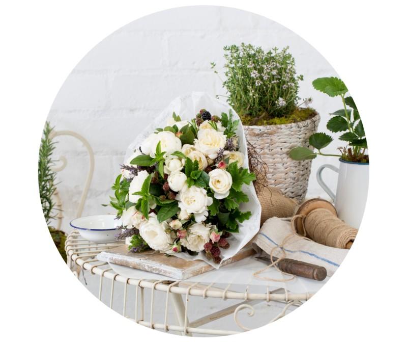 One of the most original floral arrangements. Learn the spiraling technique used to create posies and bouquets. This spin on the traditional posy incorporates fresh ingredients from the garden.